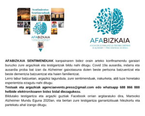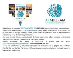 Además del retorno a la actividad de los usuarios y la Marcha virtual, entre las novedades del programa de la entidad vizcaína destaca la campaña Sentimientos AFA Bizkaia. La convocatoria se realiza para recoger los testimonios de los familiares y enfermos de Alzheimer y otras demencias durante el confinamiento hasta la actualidad, sus experiencias y sobre todo poner voz y caras a nuestro importante colectivo como valiosos documentos para las generaciones venideras. Hay que recordar que en Euskadi hay más de 60.000 personas con la enfermedad de Alzheimer y que repercute en la vida de más de 240.000 personas entre familiares y cuidadores, concluye Marian Díaz. Las fotografías y testimonios se podrán enviar a través del email agenciaevents.press@gmail.com o del whatsapp 688 866 888.